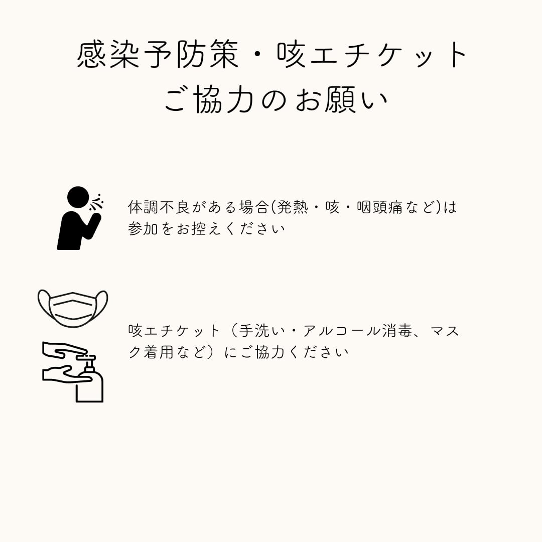 ★体調不良がある場合(発熱・咳・咽頭痛などの症状がある場合)は参加の見合わせをお願いいたします。