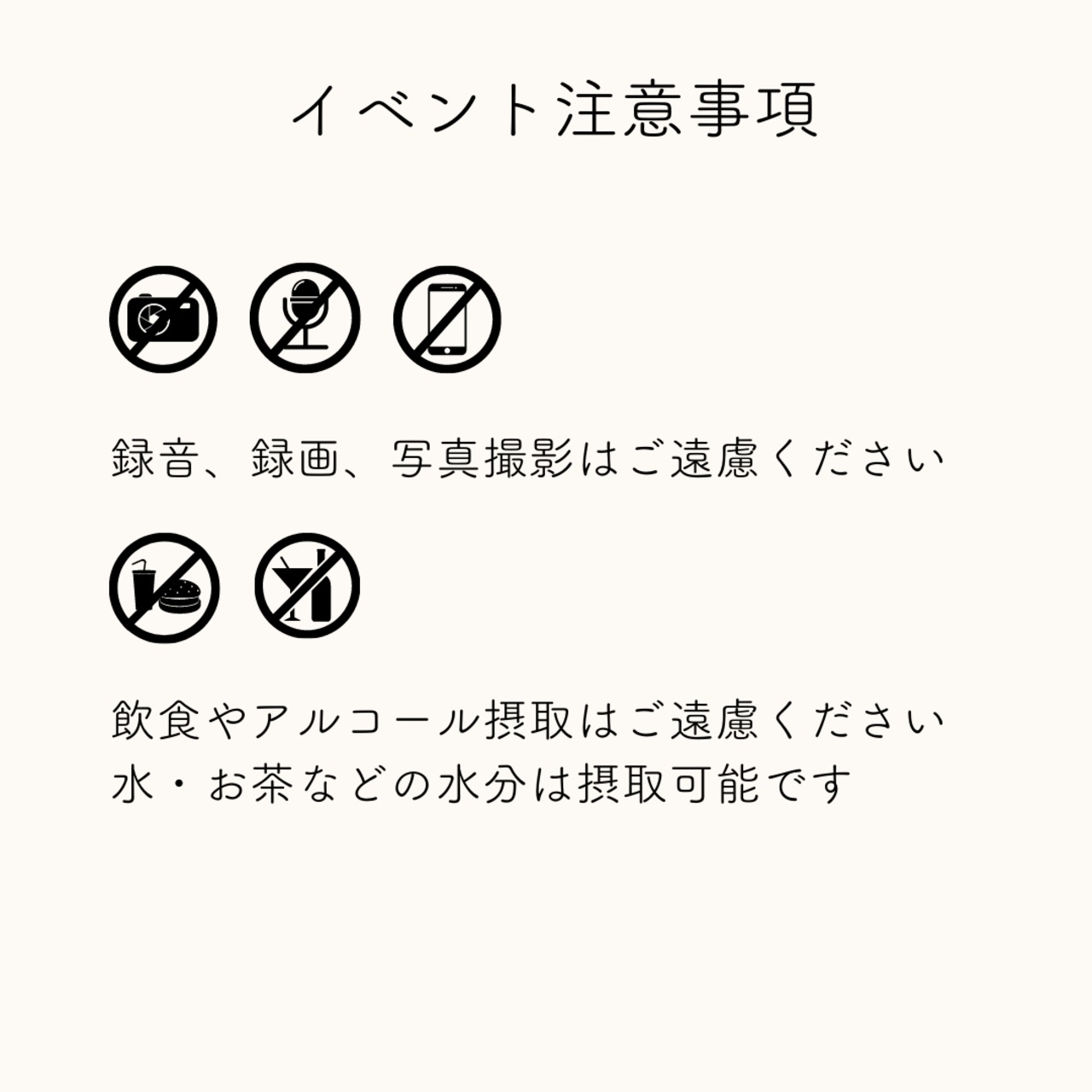 ・飲食・アルコール摂取はご遠慮ください。(水やお茶などの水分補給はOKです)